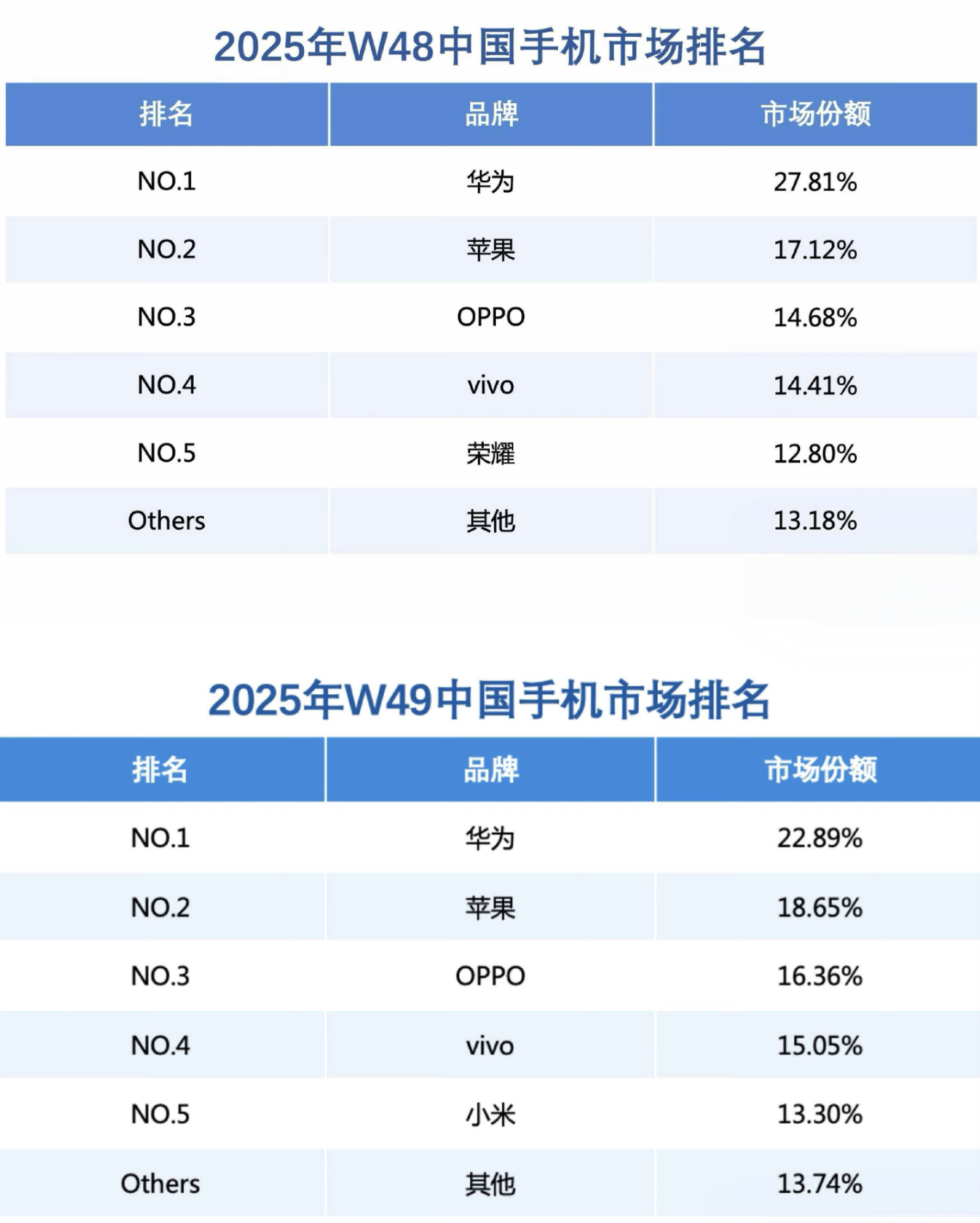 当然,一款产品究竟有多受欢迎,最终还是要以市场数据为准。根据相关媒体公布的2025年第48、49周国内手机品牌市场份额,华为重新夺回中国手机市场份额第一,连续两周超越苹果,这不仅充分印证了华为Mate 80系列定价策略上的成功,也再次彰显了“Mate”这一经典旗舰品牌在消费者心中不可撼动的地位。